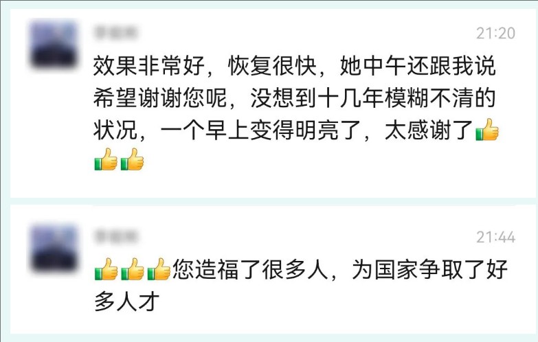"效果太好了,恢復(fù)特別快!沒想到十幾年模糊不清的世界,一個早上就亮了,太感謝了!"
